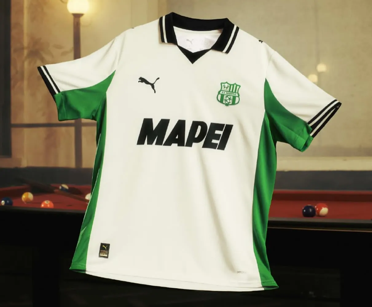La primera variante alternativa para el club de la ciudad de Sassuolo en Emilia-Romagna llevará al blanco de tono predominante en tanto que sus clásicos negro y verde se aplicarán en el cuello, los bordes de las mangas y los laterales.